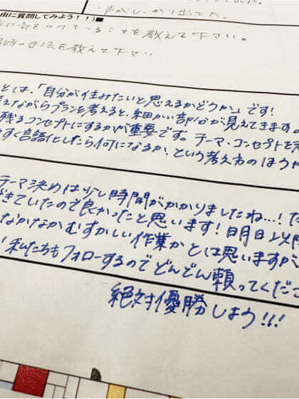 優勝を掴み、自分が描いた線が形となって完成した時の感動は、鳥肌が立つほどでした。チームメンバーと寝そべって「あ~住みたいね。」と思わず口からこぼれたのは今でも覚えています。このインターンを究極に楽しむコツは、やはり勝って!建てること!です。感動の涙を流せるくらい一緒に頑張りましょう。